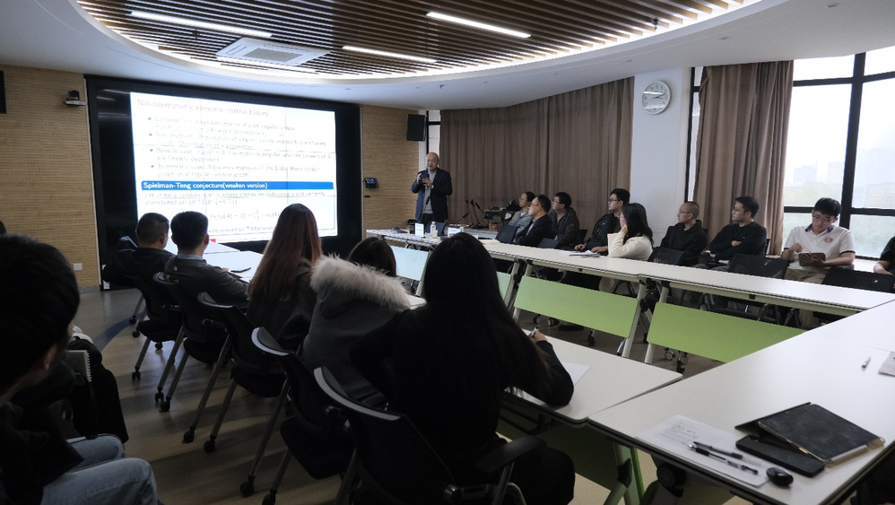 在讲座中,王汉超教授首先介绍了组合随机矩阵理论的领域背景,指出该领域是近年来备受关注的研究方向,与渐近几何分析及著名猜想紧密相关。同时提到,对称矩阵的特征值与特征向量分析是该领域的核心课题,当前在高维数据场景下,其理论性质的刻画面临极大的挑战。接着,他重点介绍了其团队近期的研究成果,针对非齐次对称随机矩阵,提出了建立了新的小球概率不等式。该成果的核心创新点在于,借鉴新的随机反转方法,建立了新的距离定理,从而刻画了特征根和特征向量的非渐近刻画。王教授的成果非常深刻,具有重要的理论价值,不仅与很多著名猜想紧密联系,而且拓展了集中不等式在组合随机矩阵领域的应用。